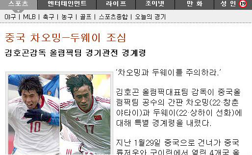 新浪体育讯 本报讯(记者周超)韩国《日刊体育》在中国国奥队的四国赛结束后报道说。韩国国奥队主教练金镐坤已经发出了戒严令,“一定要小心中国国奥队的两名球员曹明和杜威”。