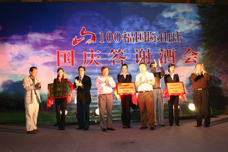 18时,在青岛丽晶大酒店丽晶殿举行了隆重的国庆答谢酒会。中国人居环境委员会副主任、国家居住环境与工程中心原副总建筑师开彦,中国建筑学会副理事长、建设部专家组成员窦以德,建设部科技发展促进中心副主任张庆风,山东省房地产业协会会长刘延漠,青岛市房地产业协会名誉会长林民庆,青岛中联盈地置业有限公司董事长、总经理纪尚荣,出席此次大型酒会并为刚刚获得"中国最佳山水别墅"、"2005年度中国科技地产名盘"双项全国性大奖的100福国际山庄楼盘,和刚刚获誉"中国地产文化品牌企业"、"中国科技地产联盟常务理事单位"的中联盈地公司揭牌。
