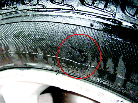 图:轮胎侧壁的伤口。朱人杰巩合生小宁摄 |