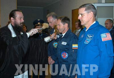 9月30日,在哈萨克斯坦的拜科努尔发射场,一位牧师向美国富翁奥尔森、俄罗斯宇航员托卡列夫和美国宇航员麦克阿瑟赐福。俄罗斯国家委员会30日在拜科努尔发射