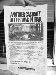 这则具有强烈反战色彩的广告指出,伊拉克战争的美国人伤亡数字现在必须加上数百名新奥尔良市飓风的遇难者。