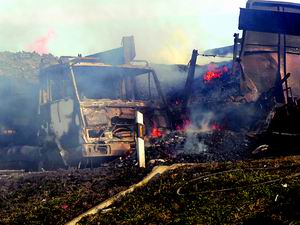 由于两货车剐蹭时油管破损,两车的油箱相继起火,并迅速引燃了混在一起的煤块和电石,黑色的浓烟和火苗一下子冒了起来。