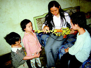 昔日的少女作家庞秀玉与她的三个孩子在一起。