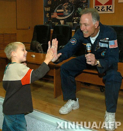 9月30日,在哈萨克斯坦的拜科努尔发射场,美国富翁奥尔森和他的孙子隔着玻璃相互问候。新华社发