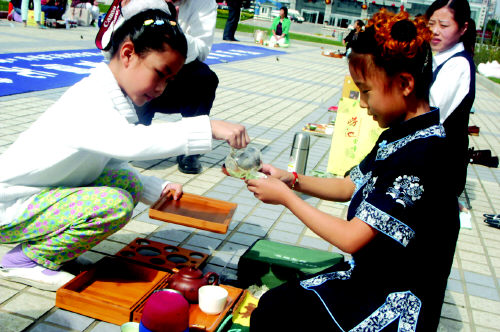 无我茶会。大家围成环形,席地而坐,泡茶、敬茶、品茶。茶友中年龄最大的60岁,最小的只有8岁。    茶会中年龄最小的张姗从五六岁就开始跟随爸爸学茶艺,昨天她穿着一身有民族气息的小褂,端坐在茶具前,泡茶的每一个动作都有板有眼。茶友陈秀云品完她泡的茶,点头称赞。    如何才能泡出一杯醉人的好茶呢?青岛市茶叶学会张秘书长介绍说,首先要了解茶性,是老是嫩;二是要掌握好水温,水温高则泡茶时间要短,水温低则泡茶时间要长;三是上一泡如果茶味比较浓,那么下一泡就要缩短时间,反过来,上一泡若茶味较淡,下一泡的时间就要长一些,好将味道纠正过来;最后一点,是要把握好泡两杯茶间隔时间的长短,如果茶叶出味慢,就要多间隔些时间,如果茶味很容易浸出来,间隔时间则要短些。对茶艺感兴趣的市民,不妨照此尝试。(记者于小阳摄影报道)     身穿民族服装的小茶友泡茶的动作有板有眼,成了茶会的小明星     |