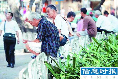 阿伯走累了,一屁股坐在栏杆上歇了起来,也许与广场设施不足有关?(10月6日摄于海珠广场)