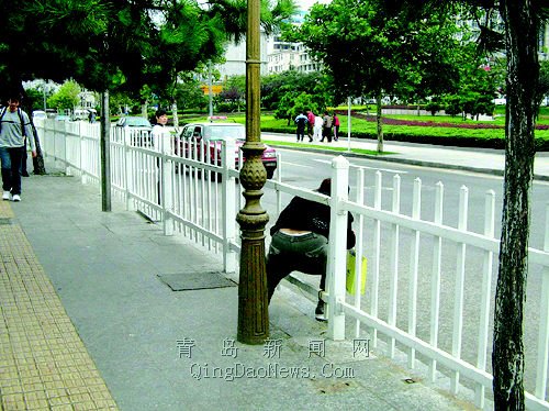 近日,太平路上栈桥景区用来阻止行人横穿车行道的一处栅栏断了两根,形成一个缺口。很多游客为走近路纷纷从这个 “缺口”出入,形成“人车争路”,造成极大的安全隐患。许多疾驶中的汽车司机常常被突然从缺口中钻出来的游客吓得赶紧躲避,有些反应慢的司机不得不从游客身边擦身而过,吓得游人死死靠在栅栏上,一时险象环生。(记者 雷林 摄影/报道)