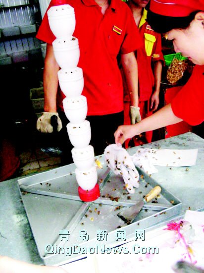 昨天中午,记者来到李村古镇路,找到了曹先生的糖球店。刚走近,就听到一阵嗡嗡的声音,记者看到,店的门头、冷柜、摊位上……到处都有小蜜蜂在爬上爬下,操作间里也有大批蜜蜂飞舞。店员们看来已经习惯了这些蜜蜂的存在,任它们飞来飞去,自顾自地干活。曹先生说,每天早晨一开门这些蜜蜂就飞来了,到晚上四五点自己就飞走了,这种情况已经持续半个多月。