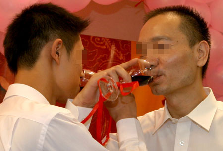 昨日近百人参加了李锦生、高杰的“虚幻庆典”,其中包括李锦生77岁的老父亲、68岁的老母亲。这对老人家坦然地、微笑着送上了祝福:“希望你们好好珍惜,能够白头到老,幸福地生活。”李锦生的父亲说,10余年前,他就知道了儿子的性取向,“当时我也不能接受,我想让他转回来喜欢女性,不断给他介绍女朋友等等,但无论怎样努力也不能成功。后来慢慢想通了,只要他感到幸福,不做违法的事,好好工作对社会有所贡献,加上孝顺父母,也就行了。”