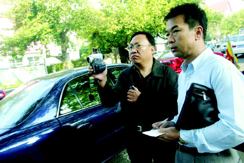 有关部门工作人员正在现场记录车牌号码并拍摄录像以进一步调查