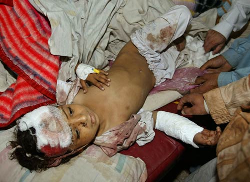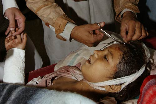 在巴基斯坦的曼塞赫拉,一名在地震中受伤的儿童被送进了当地的一所医院。
