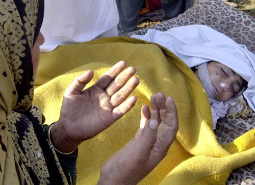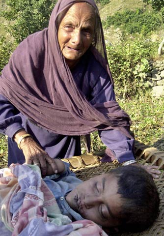在巴基斯坦西北边境省的巴拉果德,萨达尔望着在地震中死去的孙子伊姆兰悲痛不已。