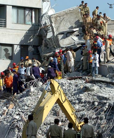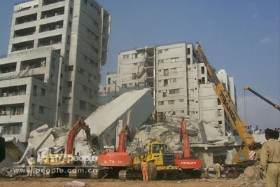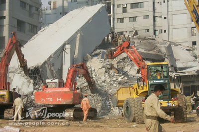 在8日发生的强烈地震中,巴基斯坦首都伊斯兰堡一座10层的公寓楼发生坍塌,数百人被压埋在瓦砾堆中。目前,20多台重型机械设备正在现场轮番挖掘残垣,争取尽快搜救出受