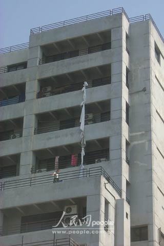 另一座楼中的居民在地震中用床单等物绑成绳索,准备顺窗爬下逃生。