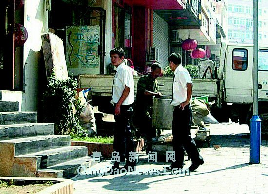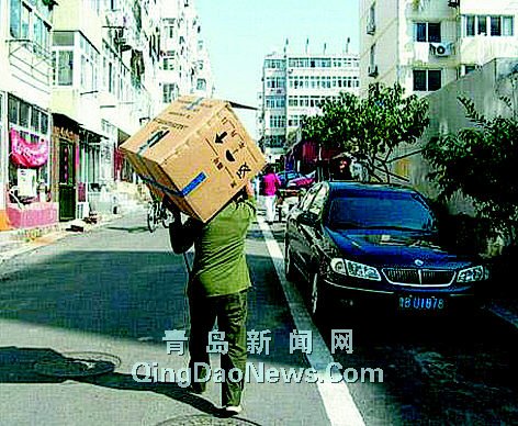 老汉将桶装在纸箱后,并没有马上走,而是四处观望(图2),好像是在躲着人,在观望几分钟后,他扛起纸箱,大摇大摆地穿过街头(图3)。“我当时在后面紧紧地跟着,不知他到底要到什么地方,并边走边拍。拐了几个路口,他将纸箱扛到了东昌路12号一个废品收购站(图4)。”