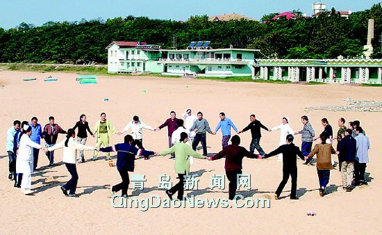 八大关第二海水浴场的沙滩上游玩。    医护人员和患者先是集体活动,所有的人围成一个圈,根据号令转动,在听到找朋友的指令后,每五个人凑在一起,多于或少于五个人的,男患者要被罚做俯卧撑,而女病人则可以用起立下蹲代替。游戏间,沙滩上充满了欢声笑语。    据了解,青岛市精神卫生中心采取这样的举措是为患者早日康复社会搭建“桥梁”。张毅民牟绍顶摄     |