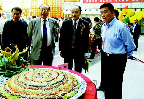 山东省烹饪协会会长孙光远(右三)、中国烹饪协会副会长高炳义(右二)、等在青岛市首届老年健康饮食文化节现场参观。