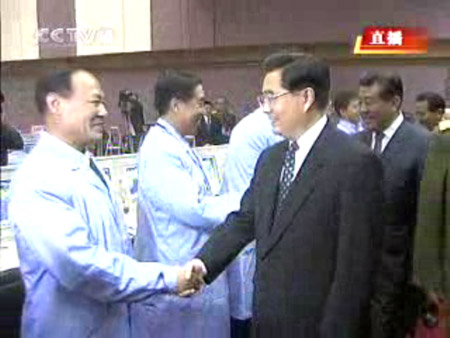 中新网10月12日电 胡锦涛等中央领导同志与北京航天飞行控制中心工作人员亲切握手,热烈祝贺神舟六号发射成功。