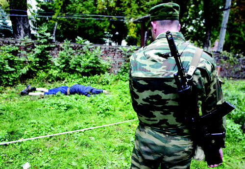 一名俄罗斯士兵看守被打死的武装分子新华社/路透 |