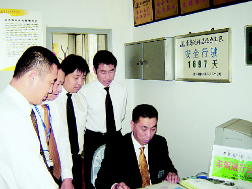 青岛远洋运输公司机关服务中心坚持“安全是生命,服务是岗位”管理理念,着力打造品牌形象,所属200多部车、300多名驾驶员已累计安全行驶1700天。近年来,先后获得中远集团文明示范窗口单位 、青岛市职工诚信示范岗等多项荣誉。图为中心负责人与驾驶员在研究行车安全措施。杨敬茂摄