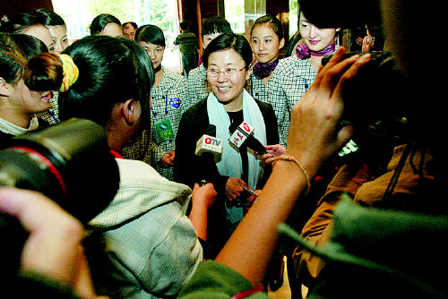 导演李少红(中)刚一抵青就受到记者的追访(徐崇德 摄) |