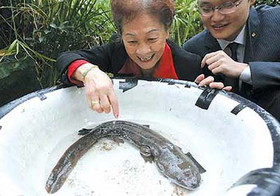 担心娃娃鱼饿着,宋女士还找来鱼食喂,谁知它不理不睬,宋女士很着急。她马上与记者联系,希望为娃娃鱼找个新家。记者赶到宋女士家看到,这条娃娃鱼有70厘米长,身上还有不少泥浆,它睁着一双小眼警惕地看着周围的人,在它的身下,还有不少宋女士投放的鱼食。