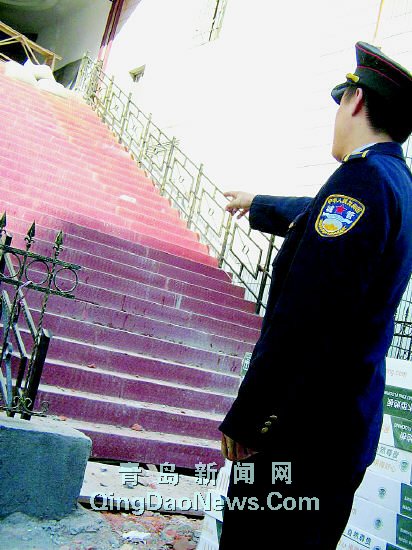 经现场调查,泰安路14号房产属金海大酒店,目前包给澳星网吧,正在装修还没开业,负责人王某现场承认,他们未经任何行政部门批准,擅自将围墙拆除,改变了墙体立面建起了约斜高10米、总面积达40多平方米的楼梯(见图),执法人员在现场查无相关审批手续的情况下,依法责令该单位停工,并补办相关手续。