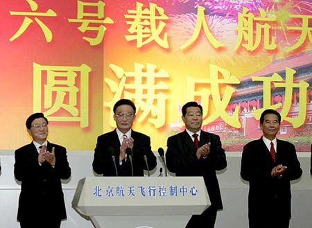 10月17日凌晨,神舟六号飞船成功返回地面。中共中央政治局常委吴邦国、贾庆林、黄菊、吴官正等在北京航天飞行控制中心观看飞船返回实况。吴邦国宣读中共中央、国务院、中央军委贺电。 新华社记者刘卫兵摄