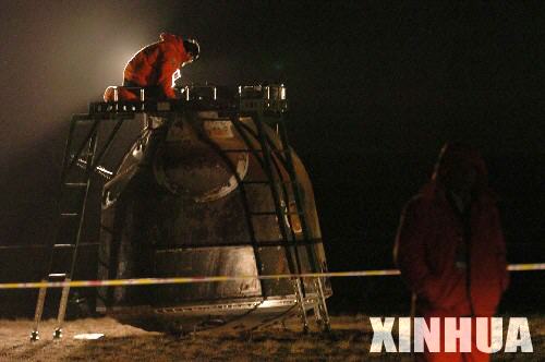 10月17日4时33分,神舟六号返回舱在内蒙古四子王旗中部草原成功着陆,航天员费俊龙、聂海胜平安返回。新华社记者 王建民 摄
