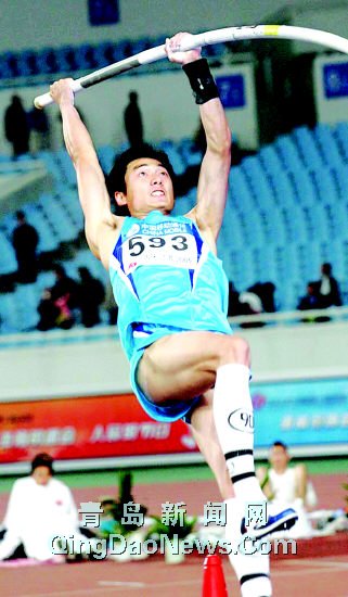 昨天晚上将近10点钟了,南京奥林匹克体育场里只余东南角的男子撑杆跳高还在继续进行比赛。而赛场上只剩下了一个高挑的身影,他就是593号山东青岛选手刘飞亮(左图)。他这个时候已经获得了金牌,正在向自己保持的5米70的全国记录发起冲击呢。结果三次试跳5米71都没有成功。