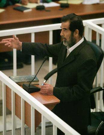 萨达姆:他们连一支笔或一张纸都不给我,或许因为现在纸张是很可怕的东西。我并不是针对你们。不过为了维护正义、以及那些选我(做总统)的伟大伊拉克人,我拒绝回答这个法庭的问话,我保留宪法赋予我作为伊拉克总统的权利。你们很清楚这一点。