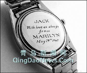 据路透社报道,这只金表背后镌有如下字样:“给杰克,连同一如既往的爱,玛丽莲,1962年5月29日”。    拍卖行说,这只金表于17日由一位美国收藏家拍得。这家拍卖行介绍说,肯尼迪当时收到这件礼物后感到十分不安,把这只金表交给了助理肯尼思·奥唐奈处理,还附了一张写着“摆脱它”字样的纸条。现已亡故的奥唐奈后来把这只金表给了自己家人。     |