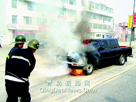 岛路与福州路交界处时,车头底部突然起火,带着火舌的皮卡车行驶出50多米远后,司机方发现。