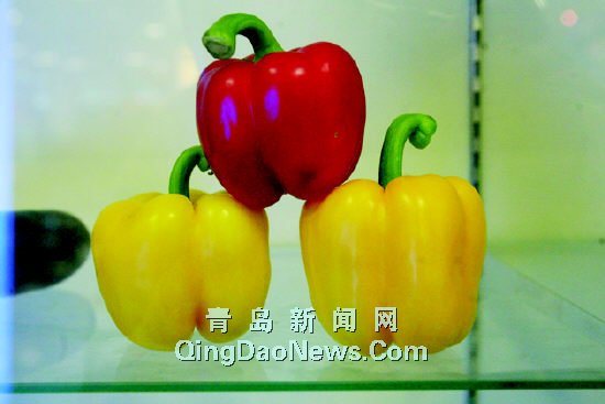 农交会上有些产品是用来展示的,虽然不能“据为己有”,但也可以让人大饱眼福。昨天,农交会上的红色“青椒”和黄色“青椒”就让纪春玲感到很惊奇。据参展方平度市崔家集镇坊头村农民蔬菜协会工作人员介绍,它们分别叫方舟、白公主,都是新培育的品种。莱西的寿桃也来助兴了,“中华寿桃”小的有半公斤,大的近1公斤,让人垂涎欲滴。