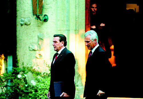 |  | | ▲10月18日,在德国首都柏林,总理施罗德(前左)离开总统官邸。当天,科勒解除了施罗德及其内阁成员的职务。 |    彷徨成为当今欧洲政治的一个表征。这是来自底层的彷徨,