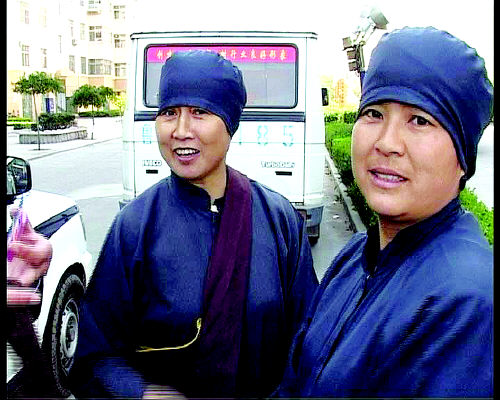 脱掉僧衣,两名“尼姑”瞬间“还俗”。前日中午11时左右,家住开发区的常先生在长江中路利用随身携带的摄像机拍摄下了两名假尼姑当街“变身”的全过程。
