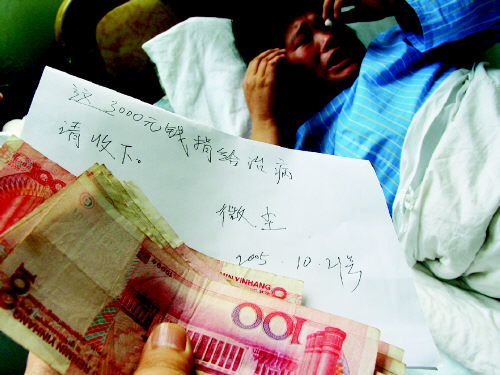 见到“微尘”送来的3000元后,躺在病床上的柏莉激动地哭了起来 |
