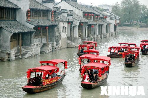 10月22日,新人们乘坐彩船在河上畅游。当日,浙江省嘉兴市举行第四届江南水乡集体婚礼,70名新人同时迈入婚姻殿堂。 新华社发(冯海军 摄)
