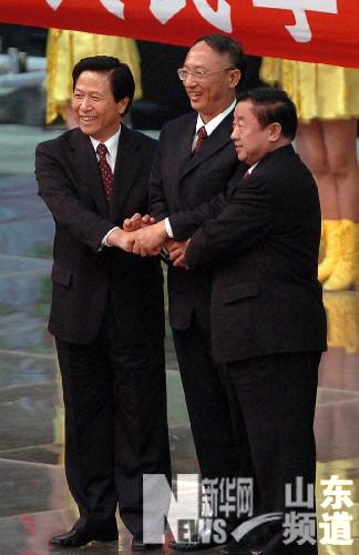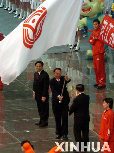 1 0月23日,中华人民共和国第十届运动会在南京隆重闭幕。这是闭幕式上的全运会会旗交接现场。 新华社记者孙参摄 这是国家体育总局局长刘鹏在闭幕式上将全运会会旗移交给第十一届全国运动会承办地代表、山东省省长韩寓群。新华社记者李勇摄 这是国家体育总局局长刘鹏(左)在闭幕式上将全运会会旗移交给第十一届全国运动会承办地代表、山东省省长韩寓群。新华社记者孙参摄 10月23日,国家体育总局局长刘鹏(中)、江苏省省长梁保华(左)和山东省省长韩寓群在闭幕式上握手。新华社记者朱峥摄