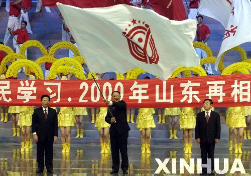 这是国家体育总局局长刘鹏在闭幕式上将全运会会旗移交给第十一届全国运动会承办地代表、山东省省长韩寓群。新华社记者李勇摄