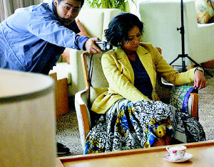 中午时分,刘嘉玲在其工作人员的陪同下出现在拍摄现场。她身着一件黑底白纹连衣裙,外面还套着一件带有荷叶边的黄绿色小短装。从进入现场到摄影师开拍前,嘉玲一直面无表情,虽然她时不时瞪瞪自己的大眼睛,似乎想让自己看来更精神些,但在拍摄的过程中,她僵硬的表情,却让她无法掩饰内心的倦怠。