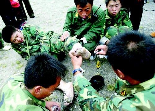 范学军笑着说,还有一个掉队了,有两个管带在陪着他往这儿赶呐。过了10分钟左右,孩子们突然爆发出一阵热烈的掌声,记者扭头一看,原来是一个孩子在两个管带的搀扶下,一瘸一拐地从远处走了过来。管带说,这是15岁的小城,来自石家庄。小城坐下后开始脱鞋,队员们呼啦一下子围了上去,记者一看,简直不忍目睹。这双稚嫩的脚底,已经磨得没有一块完整的皮肤,水疱、破皮、甚至血块都粘在一起,周围围观的村民都心疼地叫了出来。小城明明咬着牙忍痛,却告诉记者,“没事,走路锻炼了我的意志。”一名管带拿来了工具和碘酒,帮着小城上药,然后细心地帮他洗脚。旁边的一个孩子告诉记者,走了这么远的路,几乎个个孩子脚上都起了水疱。