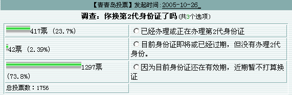 青岛新闻网10月26日发起的“你换第2代身份证了吗”调查,有1756名网友参与了讨论。其中,23.7%的网民去办理了2代身份证,73.8%的网民因为目前的一代身份证仍在有效期,没去办理新身份证,剩下2.39%的网民虽然目前的身份证已经过期,但没去更换新身份证。