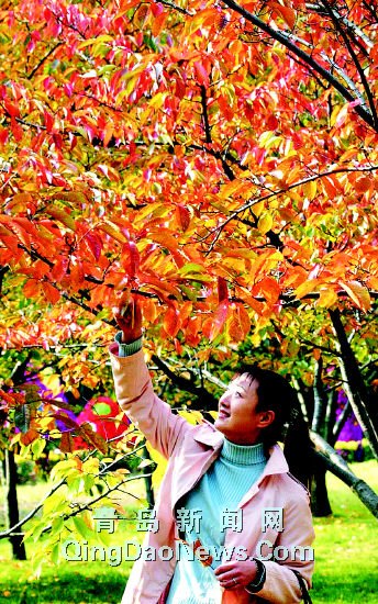 市林业局林木种苗站工程师戴月欣说,现在岛城的红叶植物就有不少,如有红枫、五角枫、九角枫、黄栌、红栌、榉树、美人梅等十余种,分布于山坡、公园、道路旁等。如现在的崂山,有的山坡就红得很漂亮,一些栎树、榉树都红叶了,一些灌木类树木经霜一打也是一片红烂漫。在浮山、市区一些山头、中山公园等处,蓝天白云下,片片红叶随处可见,张扬着金秋的活力与激情。