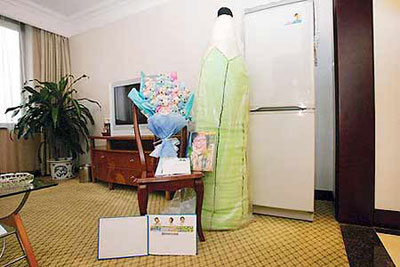 来到超女的房间,记者发现超女们入住的房间并不一样,有的是双人间,有的则只有一张单人床,但都是十分豪华的套房。一进门的房间是客厅,有白色的皮沙发,还有高大的双门冰箱、29英寸的大彩电,茶几上放着美丽的花篮和一些飘着花瓣的精致玻璃器皿。而房间一角还放置着一个方桌,如果超女们有兴致的话,还可以在一起“斗地主”。卧室的床看上去也是十分宽大舒适。