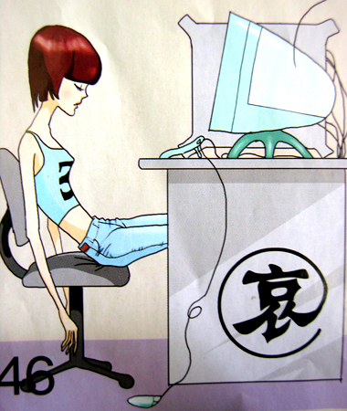 有时,电脑又像另一个自己,那一根根电线不仅接在机器上,也插入了我们身体的内部,影响我们的思维,控制我们的喜怒哀乐,通过电流和符号,我们可以在网络的虚拟空间里自由的行走,尽情的表演,电源关了,我们的生活也就成了“黑屏”。