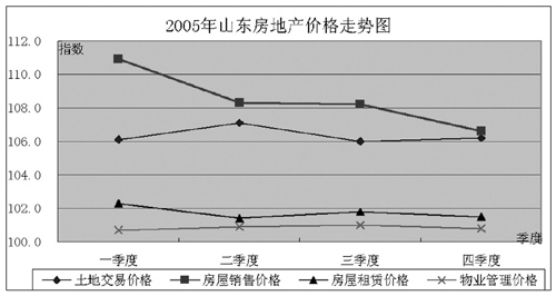 从房价统计来看,山东房地产价格涨势趋缓,升幅逐季回落。2005年房屋销售价格、土地交易价格和房屋租赁价格分别比上年上升8.5%、6.4%和1.8%,物业管理价格上升0.9%;商品房价格一季度上升9.7%,二季度上升8.9%,三季度上升8.3%,四季度上升7.3%。其中,全省住宅类商品房平均价格为每平方米2094.3元,比上年上升9.0%,一季度上升10.4%,二季度上升9.1%,三季度上升8.8%,四季度上升7.9%;二手房销售价格升幅回落4.7个百分点,其中住宅类价格比上年上升8.8%,平均价格为每平方米1465.9元。