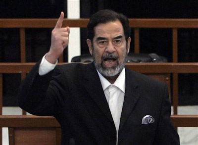资料图片:10月31日,在伊拉克首都巴格达的“绿区”内的法庭上,伊拉克前总统萨达姆听取诉讼。