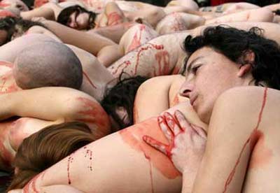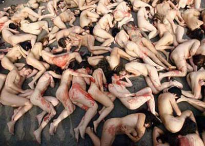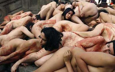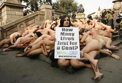 参与者一丝不挂,并往身上浇了红色染料,模拟动物受虐出血的惨状。还有参与者打出招牌“只为一件大衣要害多少条命”,主张动物权利。