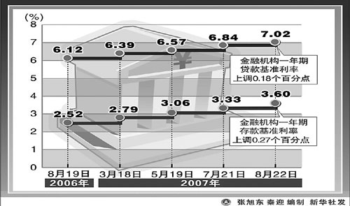 根据决定,金融机构一年期存款基准利率上调0.27个百分点,由现行的3.33%提高到3.60%;一年期贷款基准利率上调0.18个百分点,由现行的6.84%提高到7.02%;其他各档次存贷款基准利率也相应调整。个人住房公积金贷款利率相应上调0.09个百分点。